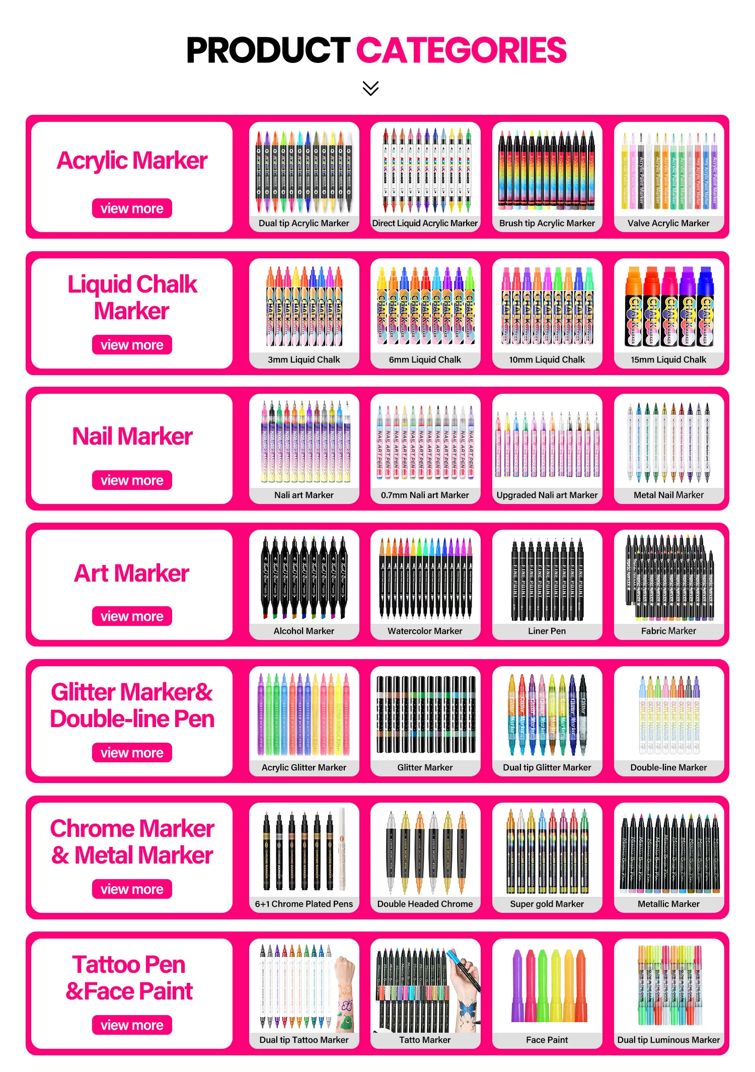 Ana ürünler:Tebeşir işaretleyici, akrilik boya kalemi, fırça işaretleme kalemleri, tırnak işaretleyici, anahat işaretleyici